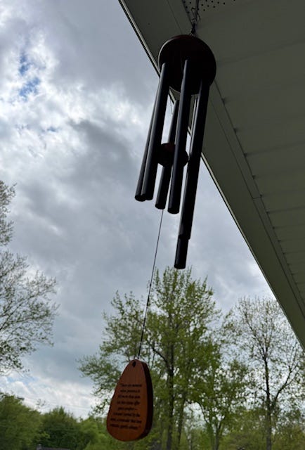 A long-time mentor sent me a lovely set of wind chimes, and so my dad hung them next to the front door. It has given me a great deal of joy to hear them periodically throughout each day and night, since every time that happens I intentionally think happy thoughts about Kellie.