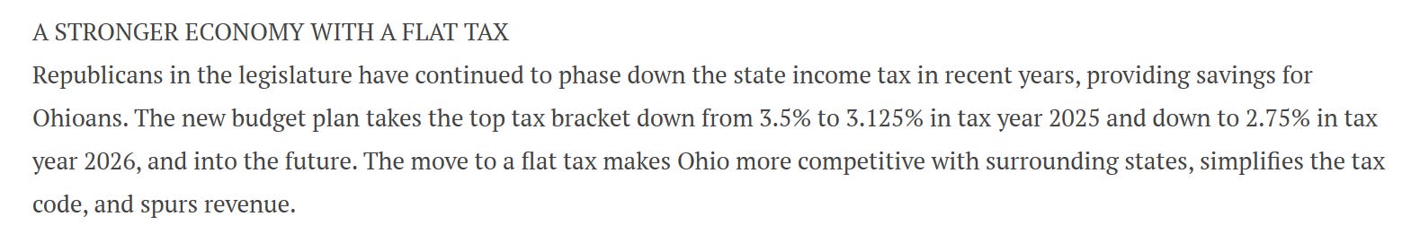 Which brings us to this week. Our governor, Mike DeWine, just signed the next Ohio state budget into law today. It included a provision that drastically changes how income tax works in this state (starting next year, and then ending with a flat tax in 2026).